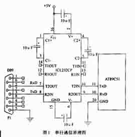 目前国内使用较多的为MCS-51系列的单片机,因此选用的单片机实验对象为一片AT89C51,图1是硬件原理图,由于要实现符合RS232C的串行通信,还应该用一片ICL232CPE(MAX232)作为串行通信的电平转换电路。在实验过程中,为了查看通信是否成功,除了让单片机对上位机回送数据外,还在单片机外围扩展了几片锁存器,几个LED发光二极管和几个小键盘。串行通信是采用最简单的TxD,RxD,GND三线制连接,注意TxD和RxD两边应该交叉连线。